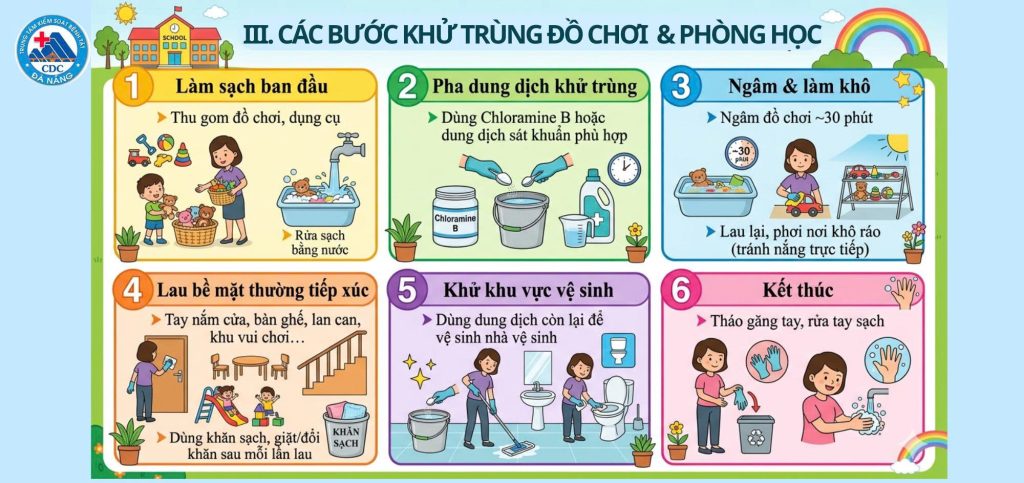 - Khử trùng đồ chơi, lớp học thường xuyên