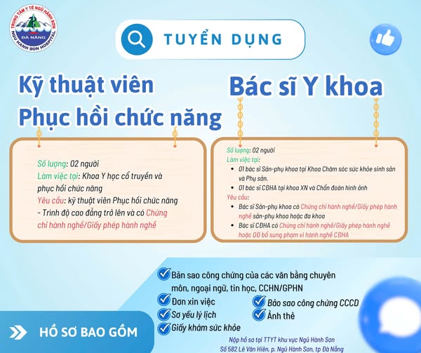 Nhằm kiện toàn bộ máy tổ chức và nâng cao chất lượng phục vụ công tác chăm sóc sức khỏe cho người dân, Trung tâm Y tế khu vực Ngũ Hành Sơn thông báo tuyển dụng các vị trí nhân sự chuyên môn y tế. Chúng tôi trân trọng mời các ứng viên có năng lực và tâm huyết gia nhập đội ngũ.